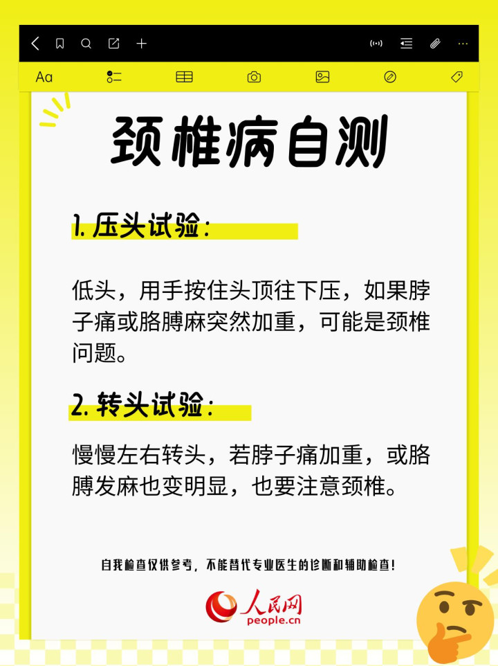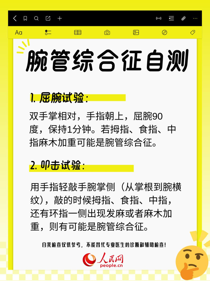 宋德恩提醒说,自测方法仅供参考,实际生活中这两种疾病可能同时存在,症状也可能与其他疾病,例如糖尿病周围神经病变、肘管综合征、胸廓出口综合征等混淆。“若手麻、疼痛持续超过1周,或出现肌肉无力、拿东西不稳,别硬扛,及时去手外科或显微外科就诊。”宋德恩呼吁,早发现、早调整、早治疗,能减少很多麻烦。